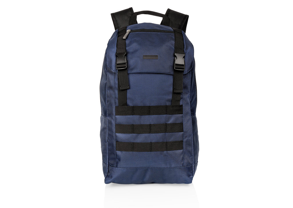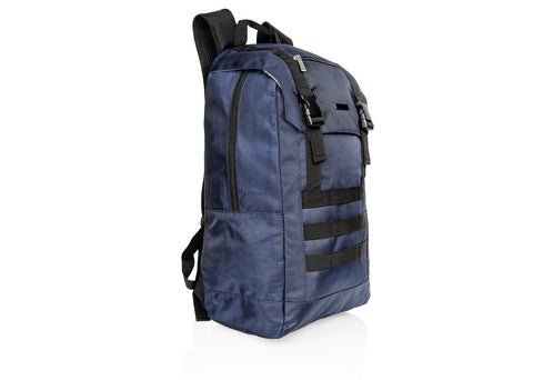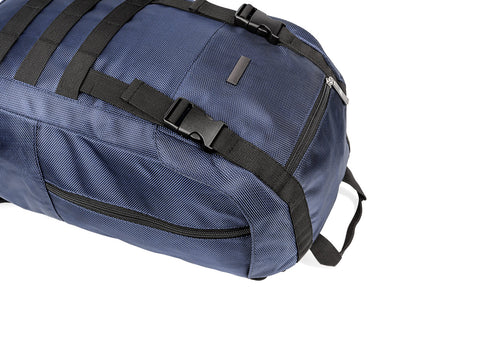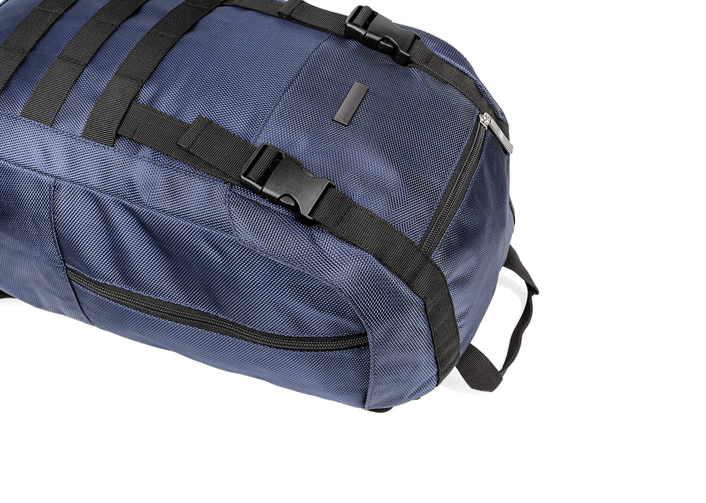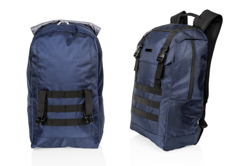 Morral para laptop con espaldar ergonómico y cargaderas ajustables y acolchadas. Cuenta con un bolsillo frontal, dos bolsillos medianos con compartimentos especiales en el interior y un bolsillo principal con un compartimento para dispositivos portátiles de 15". Además, tiene dos bolsillos laterales de malla. Incluye una placa metálica para marca láser.