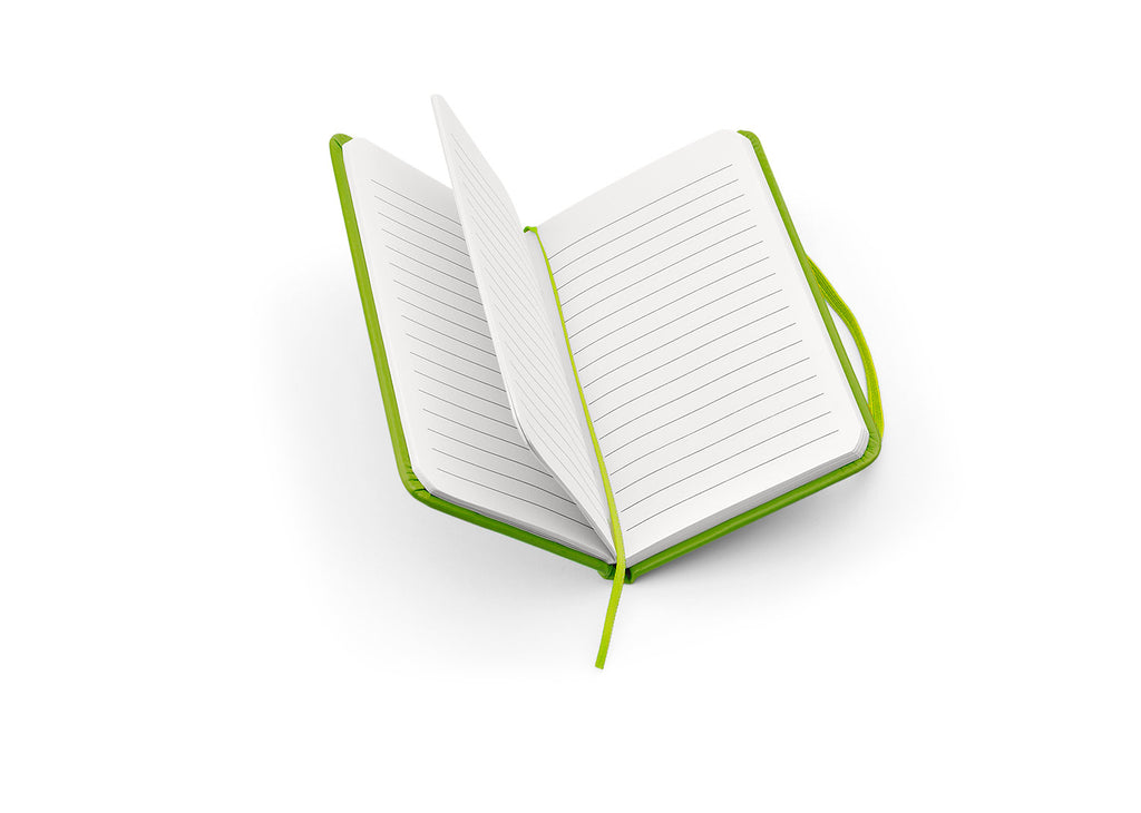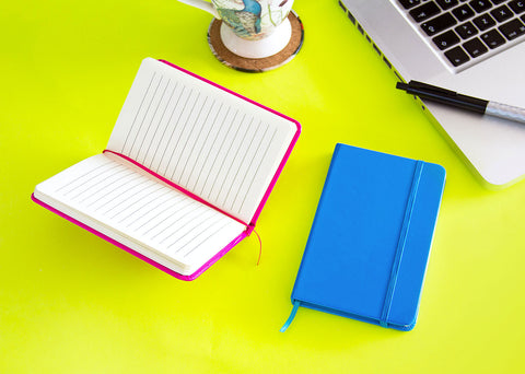 Libreta con cubierta de papel con película brillante en colores neón. 80 hojas rayadas de 70 Gramos. Tamaño aproximado: A6.