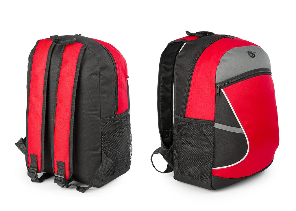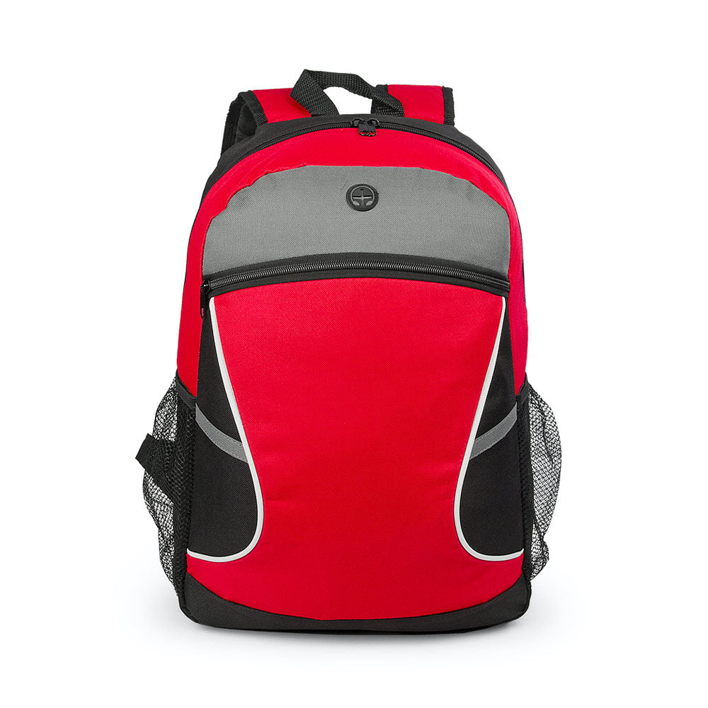 Morral con cargaderas ajustables, Bolsillos laterales en malla, bolsillo frontal y principal con cierre en cremallera y salida para los audífonos.