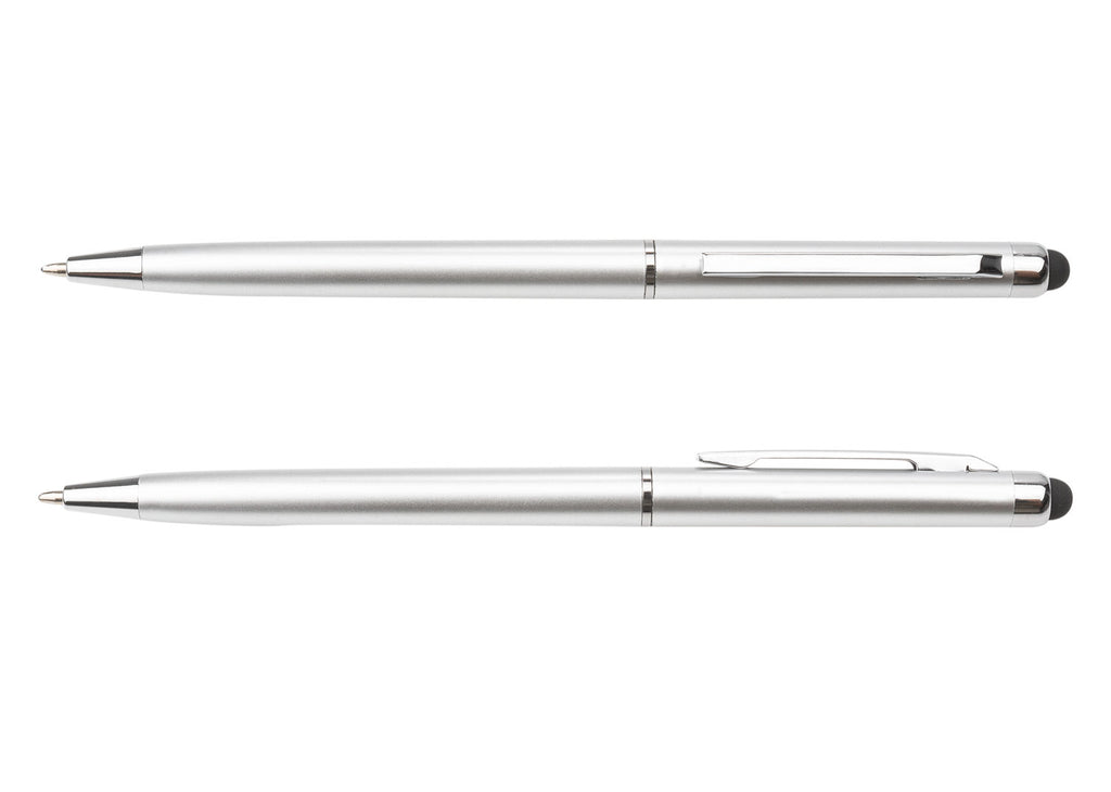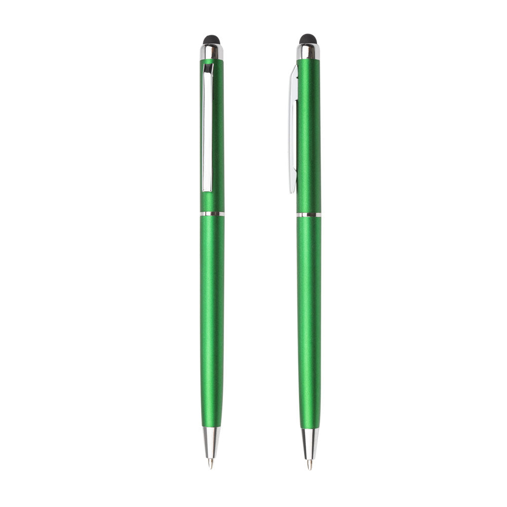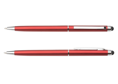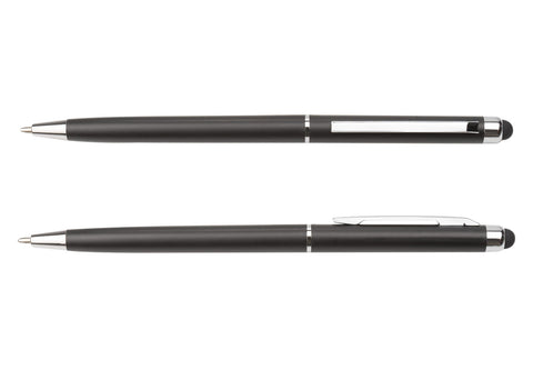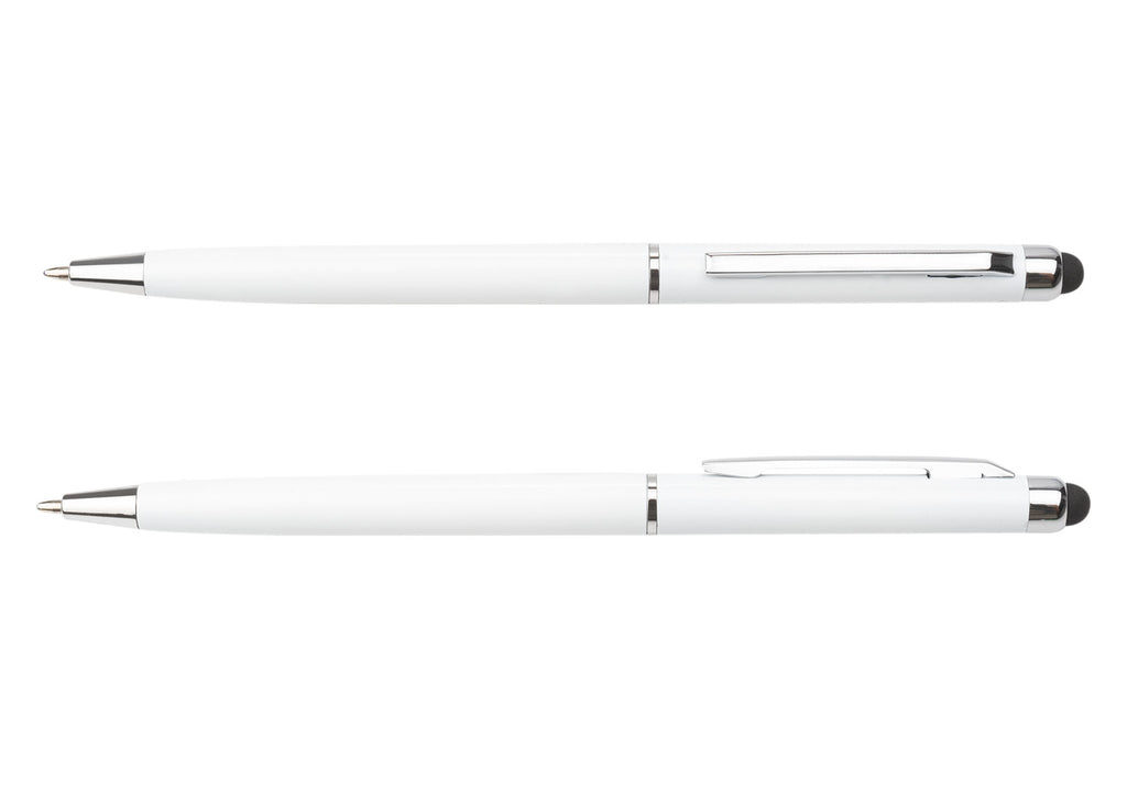 Elegante bolígrafo que combina funcionalidad y estilo, cuenta con un acabado de pintura metálica que le da un aspecto sofisticado. El clip de hierro proporciona una sujeción segura a cualquier bolsillo o cuaderno. Su stylus en la parte superior es perfecto para usar con dispositivos de pantalla táctil, facilitando la navegación y escritura digital. Sistema Twist.