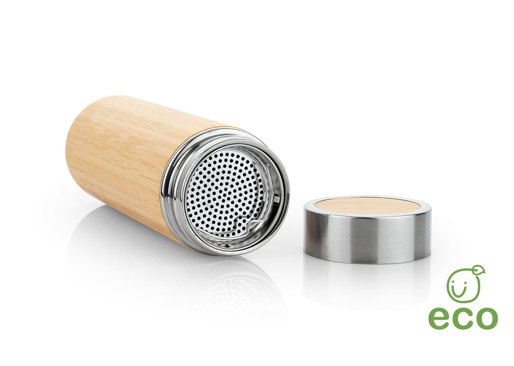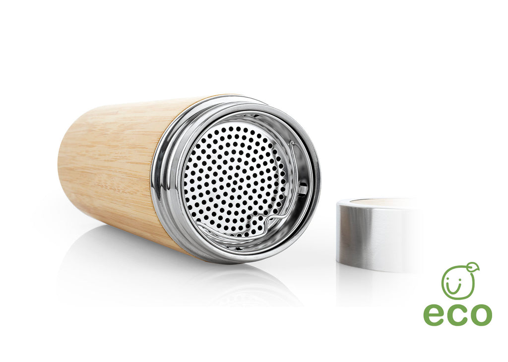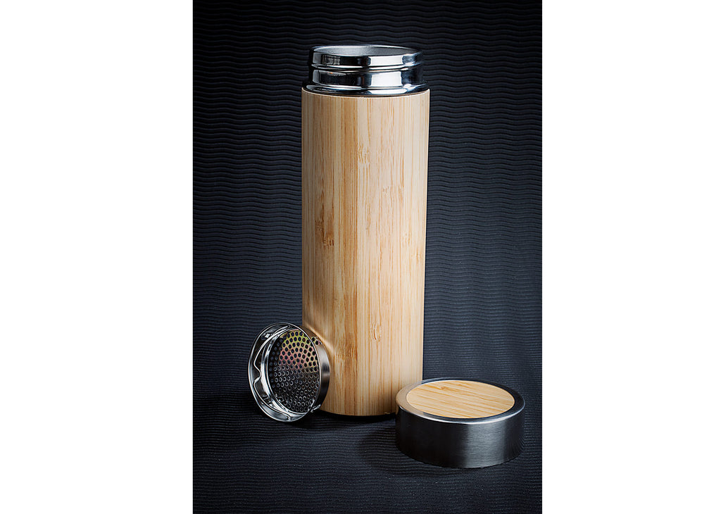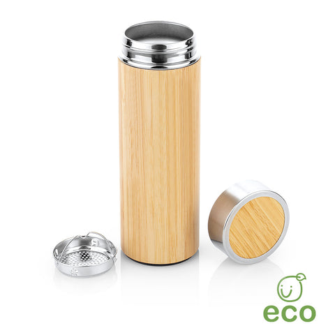 Termo doble pared en Acero inoxidable, con pared externa cubierta en Bambú, incluye infusor con filtro, y tapa con rosca. Capacidad de 500ml / 17 Oz.