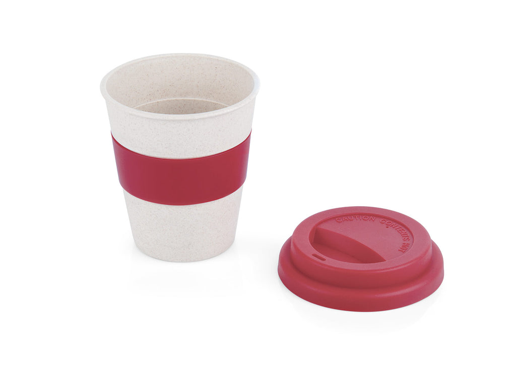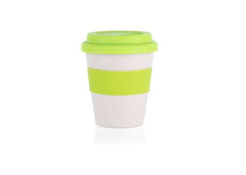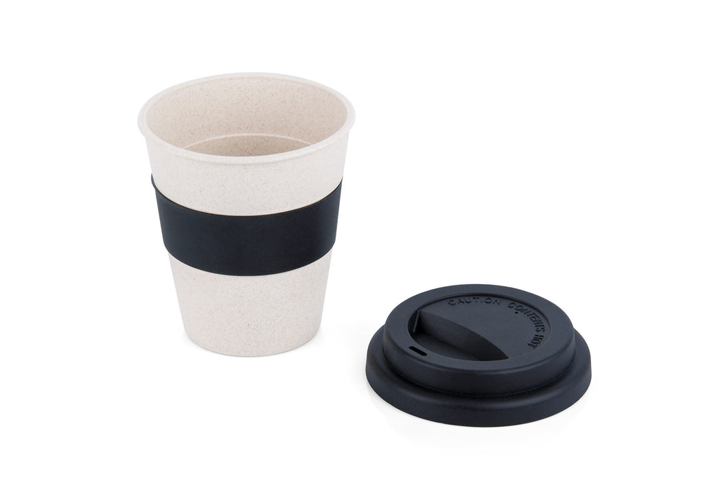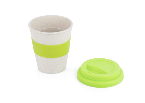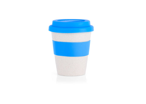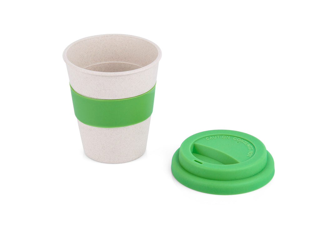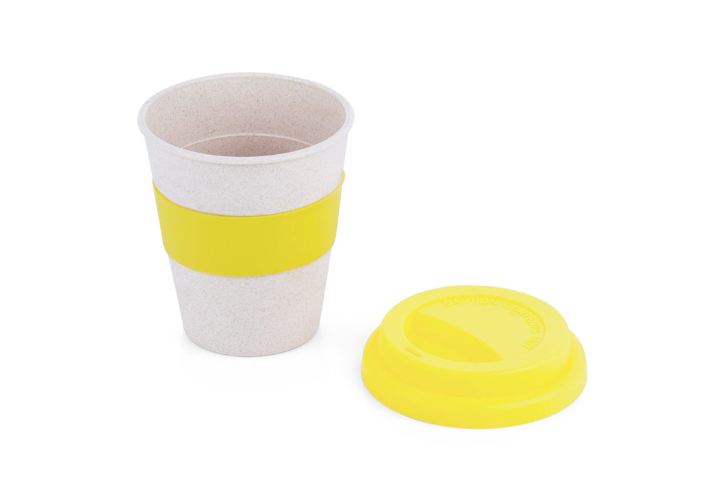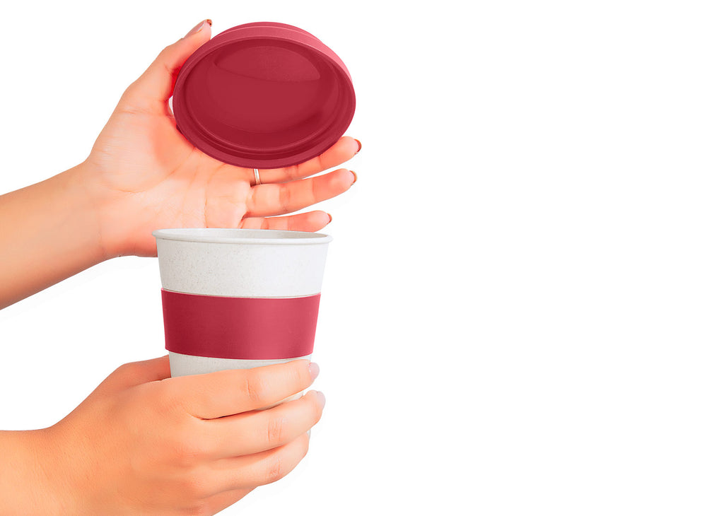 Vaso para café en fibra de bambú con banda protectora y tapa en silicona (no es tapa de seguridad). Capacidad: 350ml. Temperatura recomendada: ≤60℃.