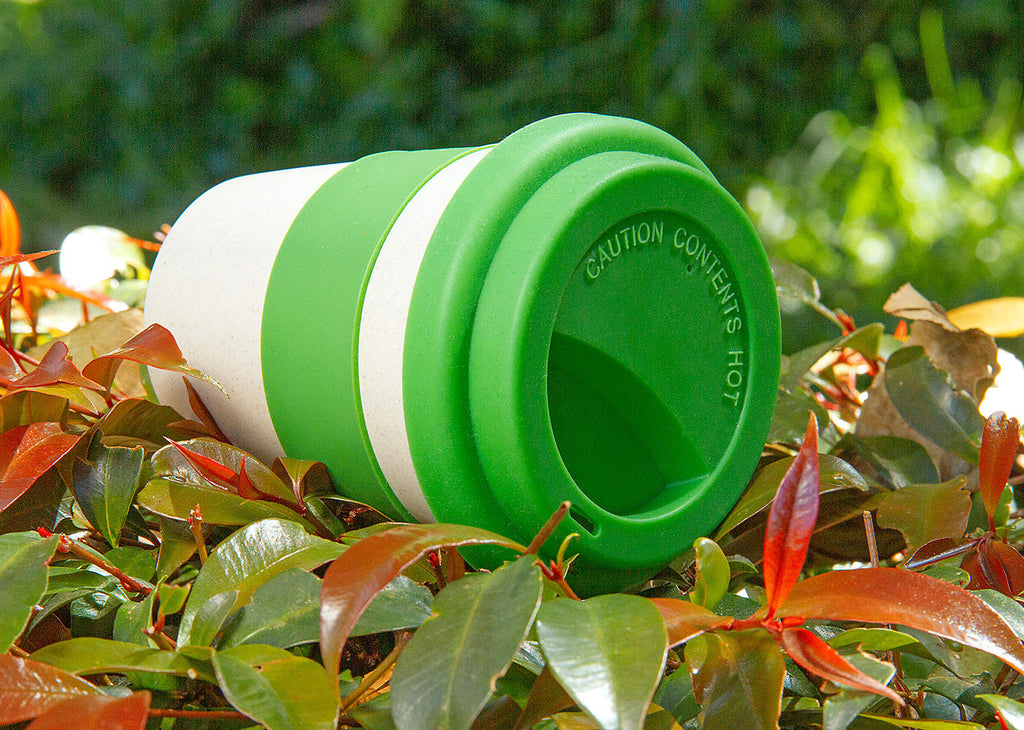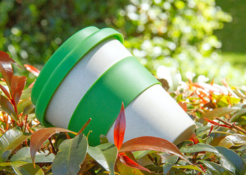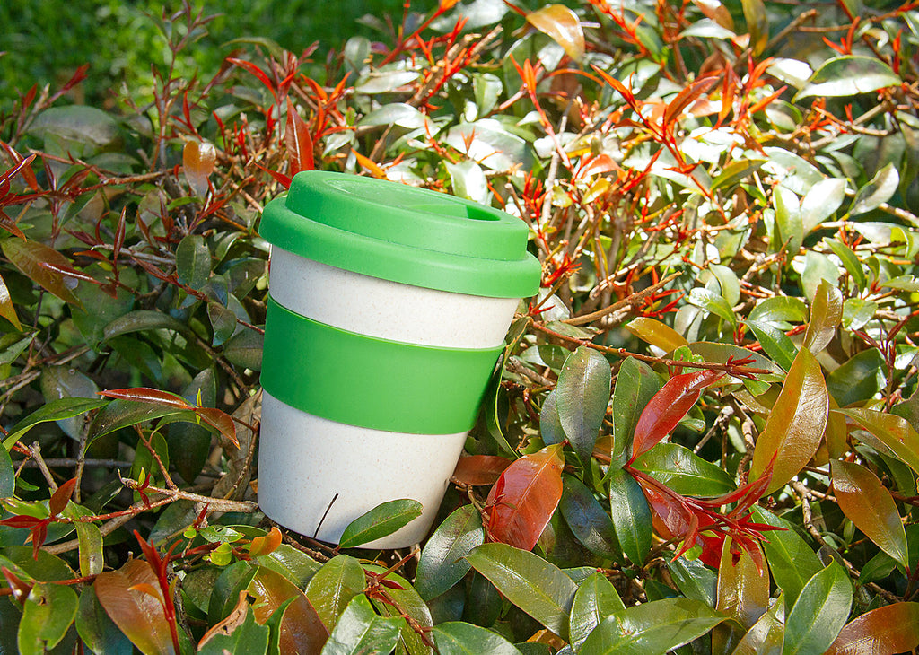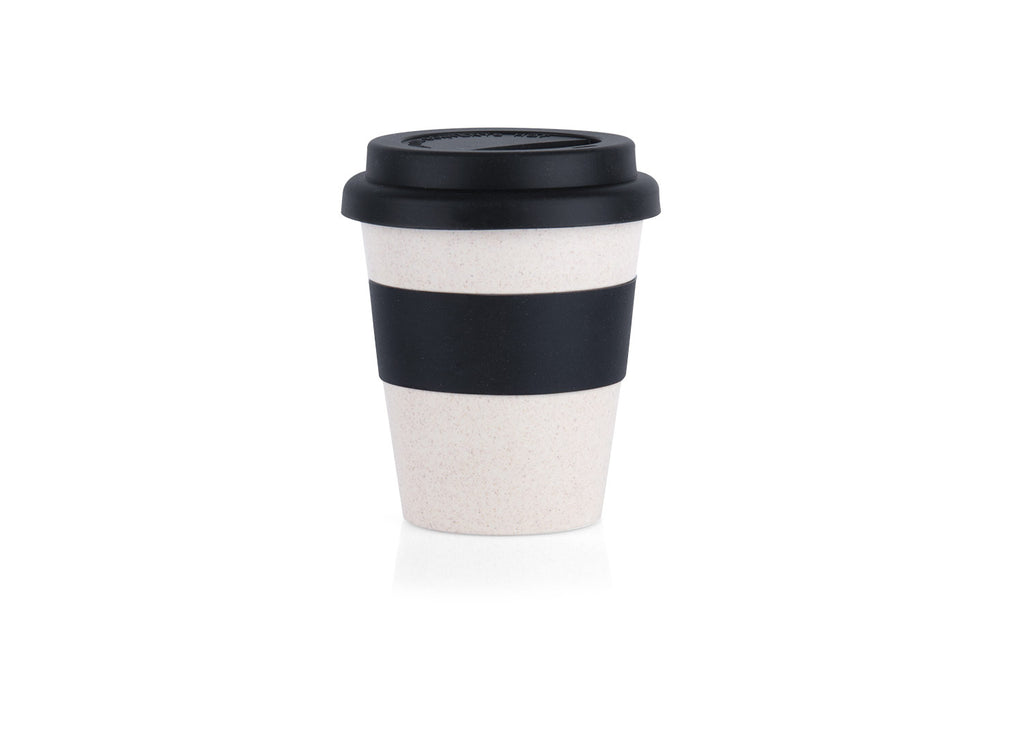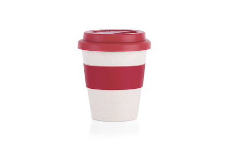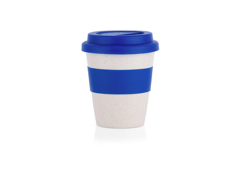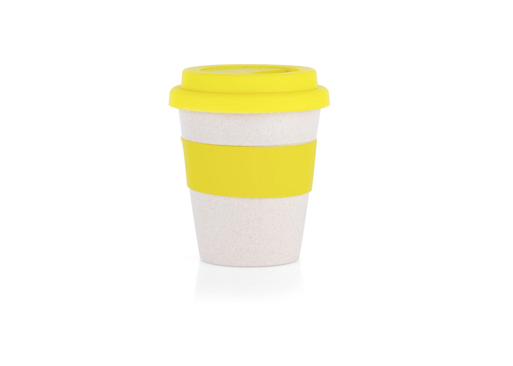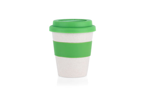 Vaso para café en fibra de bambú con banda protectora y tapa en silicona (no es tapa de seguridad). Capacidad: 350ml. Temperatura recomendada: ≤60℃.